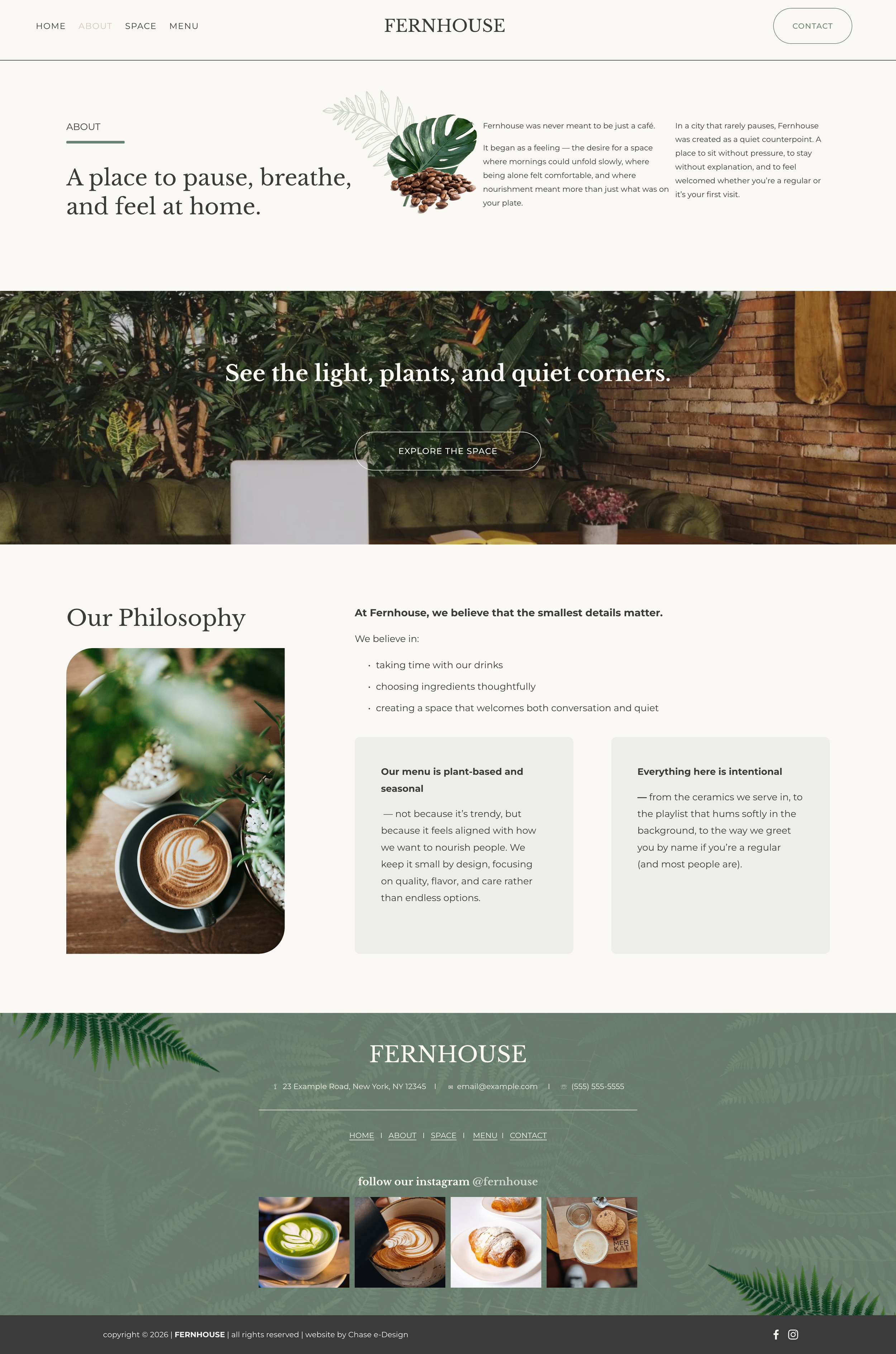 Each page included with Fernhouse has been thoughtfully designed to guide your visitor through your story, build trust, and convert interest into action:
